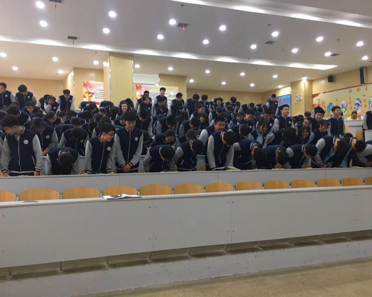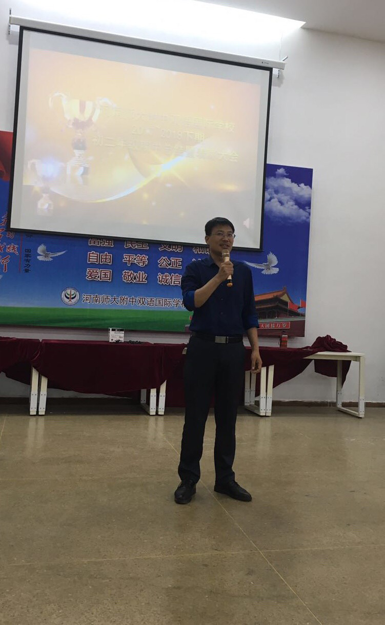心驰智行绘青春,龙腾虎跃展未来勤汗水,换来丰硕成果。经过学校严谨有序的组织,经过全体师生的共同努力,本学期期中考试工作已圆满结束。为了鼓励先进,鼓舞斗志,团结和动员全体学生以更加崭新的思想观念,更加饱满的精神状态,积极投入到今后的学习中去,2018年5月8日河师大附中双语国际学校初二年级全体师生在道德讲堂隆重举行期中考试表彰大会。参加本次大会的领导有温志忠主任、郭学明主任。