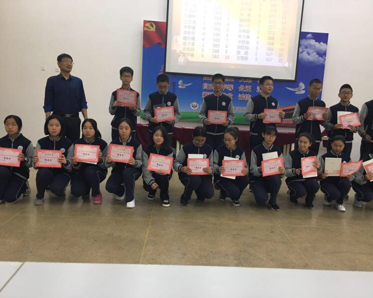 接着,主持人宣读了本次考试前二十名及单科优秀学生,并由温志忠主任、郭学明主任及初二年级教师为学生颁奖。