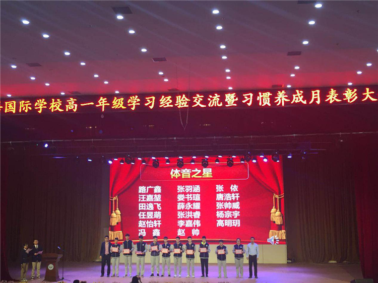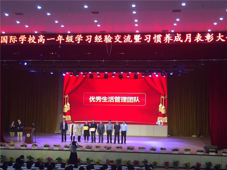 随后,学校对在习惯养成月中表现突出的同学和团体进行了表彰,分别进行了十星表彰、优秀班集体表彰、优秀教师团队表彰和优秀宿舍管理团队表彰。其中获得优秀班集体的是:高一1班、高一2班、高一3班、高一5班、高一8班、高一9班;获得优秀教师团队的是:高一2班、高一3班、高一5班、高一8班。中学部主任郭学明和高一年级主任胡腾飞为获奖学生和团体进行了颁奖。