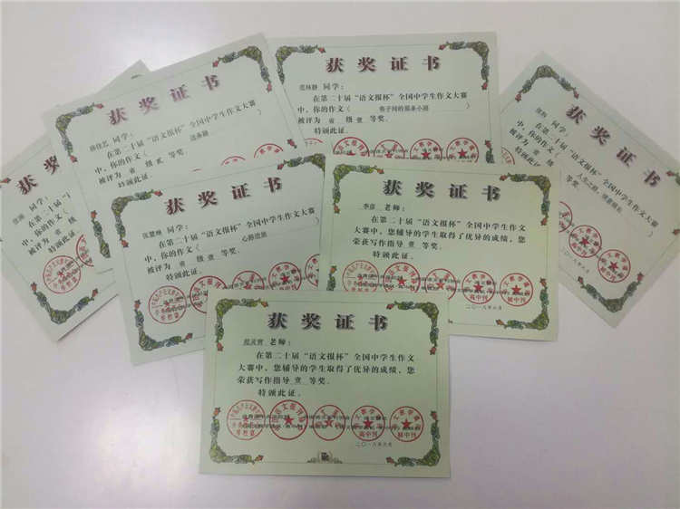 在第20届语文报比赛中,我校冷亚航、范林静、张慧琳等同学斩获一等奖,陈佳艺等同学获二等奖,张涵、张科等同学获三等奖,范灵营、李彦、刘改月、郭文毅、严洁、范孟雨、周莉等七位老师获写作指导一等奖。
