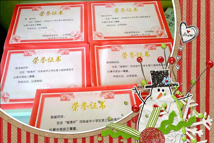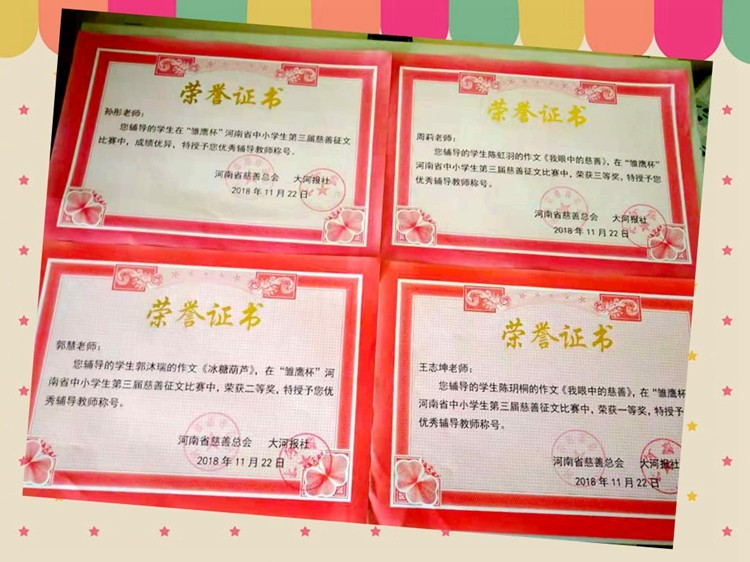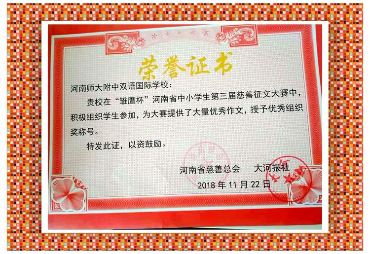 “雏鹰杯”河南省中小学生第三届慈善征文比赛获奖结果于2018年11月25日上午揭晓,我校党支部书记兼教科研发中心主任李现山代表学校赶赴郑州参加了颁奖典礼,值得祝贺的是我校5名选手从7万多名参赛选手中脱颖而出,初中组征文共有17篇作文获奖,我校占5篇,以绝对的比例成为本次颁奖典礼上的焦点,初一11班陈玥桐同学荣获一等奖,初二3班郭沐瑞同学荣获二等奖,初三2班郭晨、初二1班陈虹羽、初三2班贾薇3名同学喜获三等奖;王志坤、郭慧、孙彤、周莉4名老师荣获“优秀辅导教师”称号,河南师大附中双语国际学校被授予优秀组织奖称号!