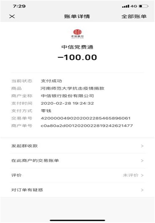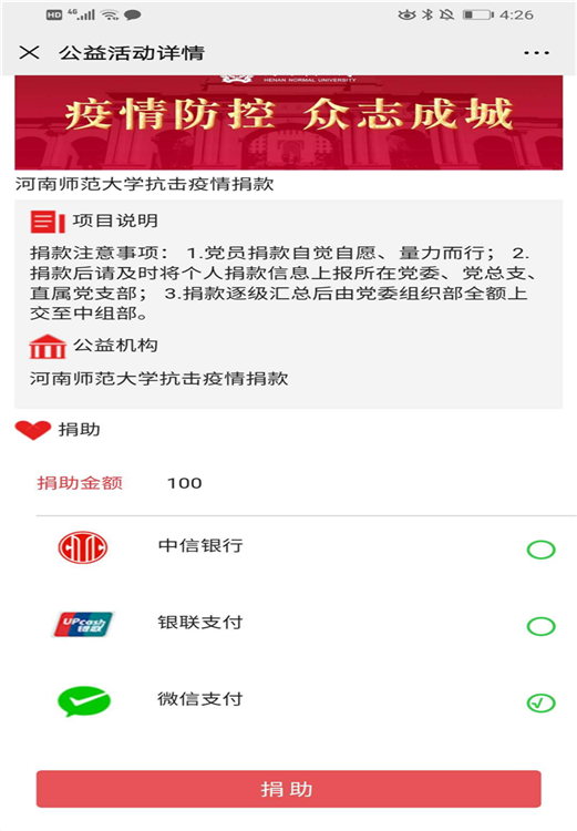 党员们在短时间内全部通过“党费通”平台中的“万众一心抗击疫情”栏目进行了捐款,截至3月5日,全校共有5个党支部81名党员通过党费通平台累计捐款7910元,所得善款将统一用于疫情防控工作。有些同志不仅在此次活动中积极捐款,早前还通过其他渠道捐款捐物,其中杨雨同志通过武汉市慈善总会专项慈善基金捐款100元,张倩茹同志为陕西某社区捐献3M口罩120个。