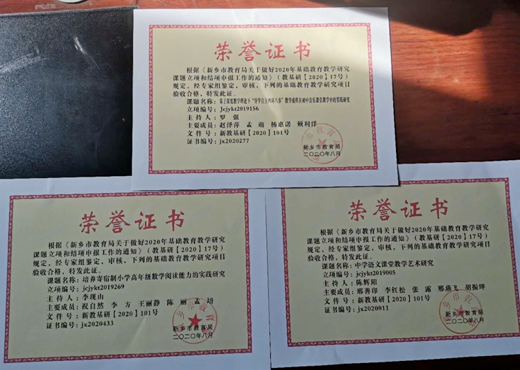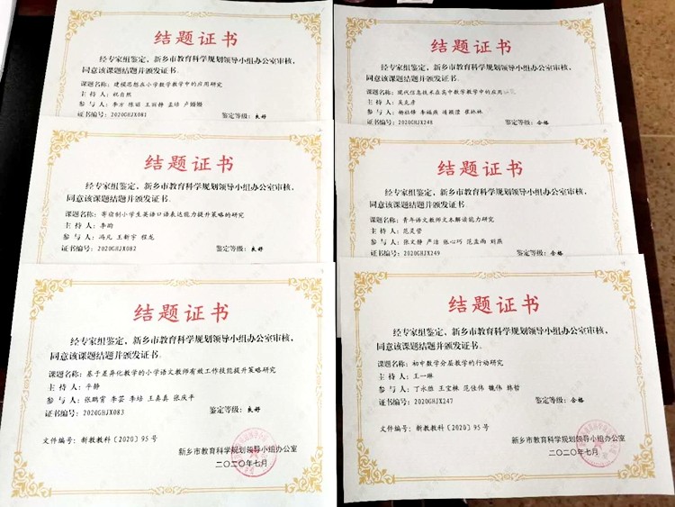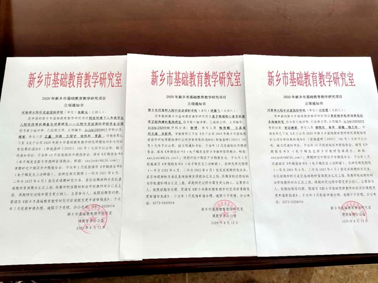 市基础教研室按照评审标准、程序、办法,分别对2020年申报结项和立项的课题材料进行了严格的评审,我校罗强副校长、李现山书记、陈辉阳老师主持的2019年基础教育教学研究课题均成功结项,付彩霞、胡腾飞、张敬远3位老师主持的2020年基础教育教学研究课题成功立项;祝自然、李昀、吴克彦、范灵营等6位老师主持的2019年教育科学规划课题顺利结项,通过率达100%,赵延勋、张晓峥、李晶晶、王彦崴4位老师主持的2020年教育科学规划课题成功立项,大家积极开展课题研究,努力探索教学改革新路,教研能力和水平有了大幅提升,望今后大家再接再厉,深入推进教育教学课题研究。