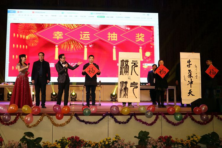 工会主席王有波和吉士彪老师的书法表演在杨惠诺老师典雅的古筝伴奏中,成为了晚会新的热点。王主席和吉老师在现场挥毫泼墨,展示出深厚和扎实的书法功底,三个福字苍劲有力、姿态各异!“牛气冲天”“元气满满”条幅气势雄浑!随后现场抽奖将作品赠送给幸运观众,将全场火爆的气氛再度点燃。接下来让人耳目一新的还有杨帆老师现场所作的滑秀林校长金粉画像,在金粉的泼洒下画面顿时拨开云雾,滑校长熟悉又可亲的面庞映入眼帘,惊艳了整个会场。