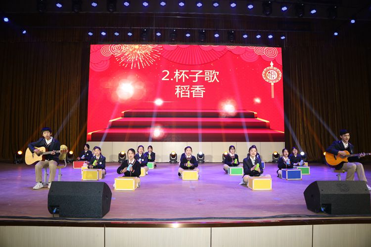 民乐班钢琴古筝曲《大鱼海棠》弦声回还往复,旋转升腾,从一朵花开到花海锦簇,一朵朵,一簇簇,一片片,一圈圈如水纹般扩散蔓延,曲音高亢婉转,花海如烟花一般四处弥漫,瞬间仿佛充塞了天地,让观众像花精灵一样被花瓣裹挟着随风飞舞,漂游于虚空,洋洋焉仙人也。“笔走乾坤恢宏气,墨染中华四时春”,双语学子的自信在笔尖流淌,书法班挥毫泼墨,一幅幅字画,一副副对联写不尽对双语学子对祖国大地的祝福。