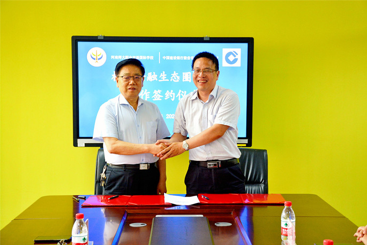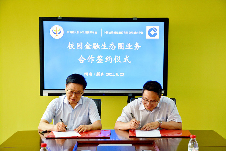 2021年6月23日下午,河南师大附中双语国际学校与中国建设银行股份有限公司新乡分行签约仪式在第一会议室举行。出席签约仪式的有:建行新乡分行行级领导高级客户经理茹祥群、建行新乡分行个人部总经理杨建伟、建行新乡洪门支行行长王保菊、我校校长滑秀林、党总支书记李现山、后勤保障部主任李卫忠及餐饮公司等相关领导。签约仪式由李卫忠主任主持。