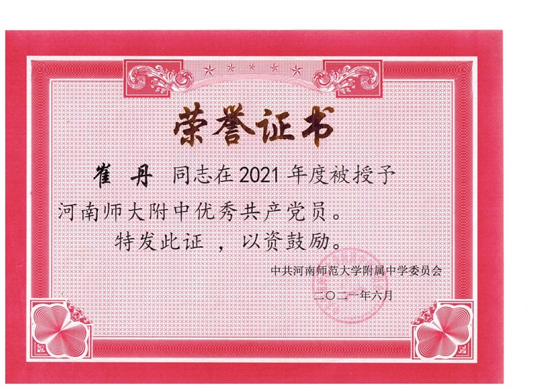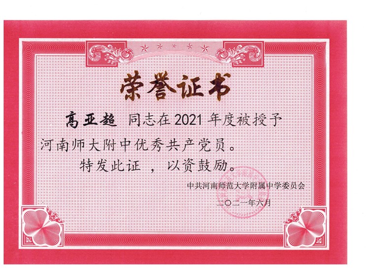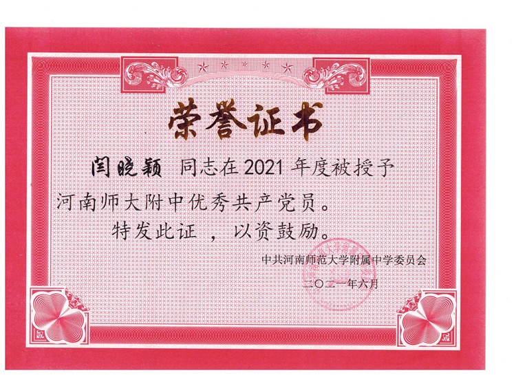 祝贺我校郭学明、崔丹、高亚超、闫晓颖、王晓慧、张慧娟等老师被评为河南师大附中“优秀共产党员”荣誉称号。