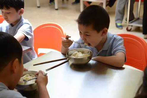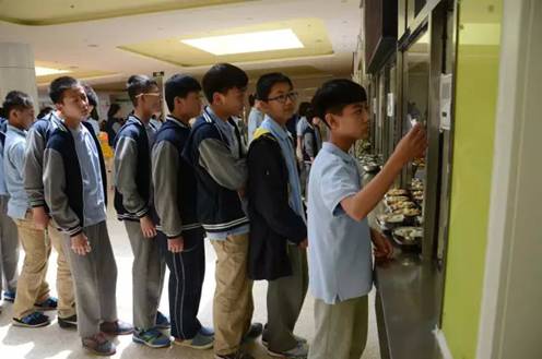结束了紧张的学习,学生们来到干净舒适的食堂就餐,食堂的厨师们已经为学生准备好可口的饭菜,每一餐都是经过营养师的精心营养搭配,可供学生自由选择。小学部的学生们在生活老师的带领下洗手,并且进行饭菜的分发。