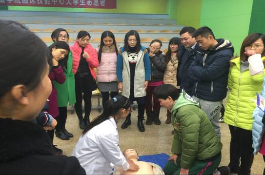 然后,新乡医学院临床技能中心的志愿者们对全体教师和高一的同学们进行了应急救治实践模拟演练,老师同学们都积极参与,热情询问,主动模拟演练。