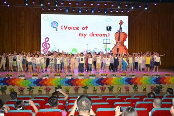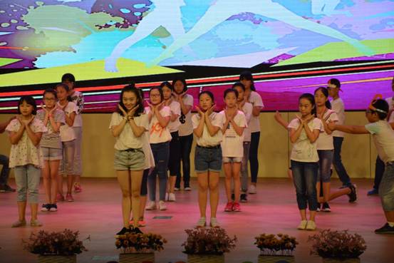 第一个节目是学生们的篮球课展示,他们精彩的球性练习以及篮球运球等专业表演给观众们带来了一场强大的视觉盛宴,不少家长禁不住感叹:篮球也可以如此有花样!第二个节目是由声乐课和英语口语课联排的音乐剧:《Voice of my dream》,这个节目由我们兴趣班的全体成员共同参演,学生们标准流利的英语唱词以及表演时的自信得体引来了各位家长老师的一阵阵喝彩。第三个节目是书法和绘画展示,大屏幕上展示了我们每一位同学在这七天里的优秀作品。最后一个是我们的形体舞蹈课展示:《大王叫我来巡山》,在表演过程中,学生们戴上了自己在美术课上做的相关道具。学生们惟妙惟肖的表演带来了观众们的热烈掌声。