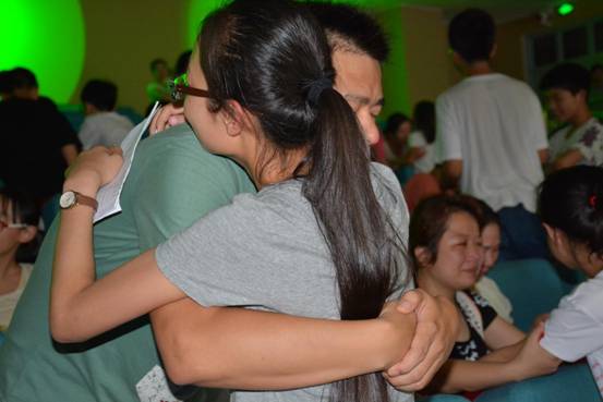 随后,进入学生和家长的互动环节——吹过心灵的风。学生代表马美汀同学上台念出了自己在写作课上给爸爸妈妈写的信,在这位同学发言结束之后,全体学生站起给身后的父母大声念出了自己写的信,对父母说声“我爱你”并和父母深情拥抱,在这么温馨感人的场景中,不少家长和学生都已热泪盈眶……