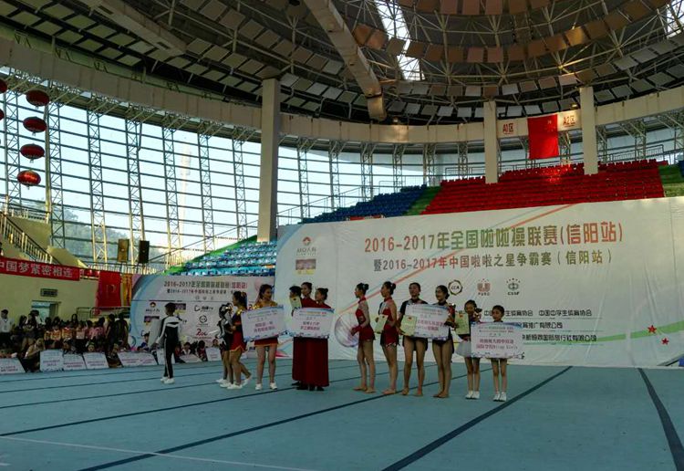 2017年5月16日至5月18日,由国家体育总局体操运动管理中心、中国大学生体育协会、中国中学生体育协会主办的2016——2017年全国啦啦操联赛(信阳站)暨2016——2017全国啦啦操之星争霸赛(信阳赛区)在信阳师范学院综合体育馆顺利举行。国家体育总局体操运动管理中心领导、全国啦啦操委员会领导等出席了盛大的开幕式。
