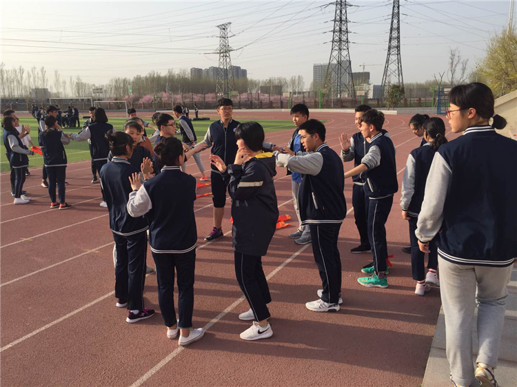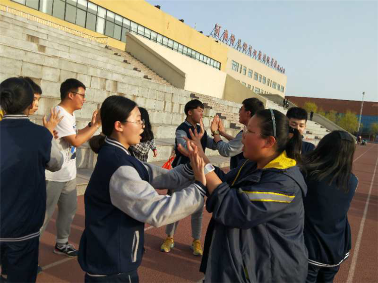 第一个比赛项目是“穿越火线”。每个小组成员手拉着手站成一排,从呼啦圈穿过去,再穿回来,不能用手拿呼啦圈,最先传送完成的班级获胜。此项目考验的是参与者的应变能力和灵敏的反应速度,以及同学们团结携手合作的精神。第二个比赛项目是“十人十一足”。每个队由10人组成,每队成一排并肩站立在规定的起点处。内侧小腿用绳捆住,这样就成了“十人十一足”。各队人员以十一条腿跑步前进,到达终点处。此项目考验的是同学们的专注度、配合力、服从力。刚开始有很多同学步伐不齐,但同学们一次次地不怕失败,改进态度、达成共识、目标一致,最终到达终点。第三个比赛项目是击掌喊出口号“我们是最棒的团队”,和左边同学击掌一次喊出一个字,和右边同学击掌两次喊出两个字,一次类推,每次增加一次击掌一个字,最先喊出完整口号的班级获胜。此项目看似简单,实则考验同学们的默契度。经过前两次的比赛,同学们很快掌握了项目的诀窍,两个班级一起口号响亮、击掌整齐地同步完成任务。