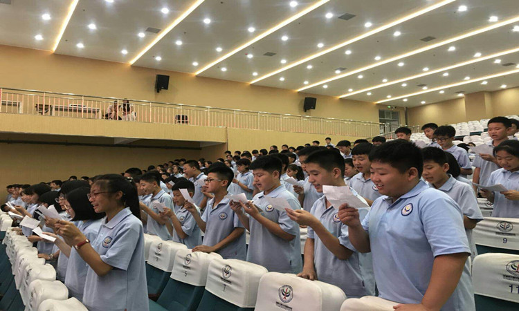 最后,初一年级全体学生在主持人荆佳慧同学的带领下,全体起立,共同宣誓:做一个勤劳的人,做一个善良的人,做一个诚实守信的双语人。在庄严肃穆的宣誓中,河南师大附中双语国际学校社会主义核心价值观大讲堂之“诚信大讲堂”篇圆满结束!