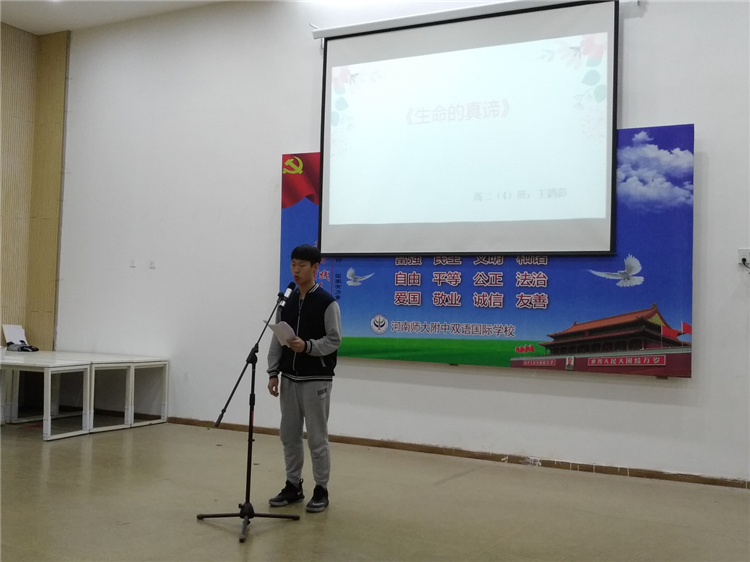 第二个环节是感恩主题演讲比赛。比赛在11月22日晚6点举行,本次比赛共有来自6个班的6位选手参加,由高二8班的两名同学作为主持人,比赛主题紧紧围绕“感恩”,给学生们提供了一个充分展示自我的舞台。