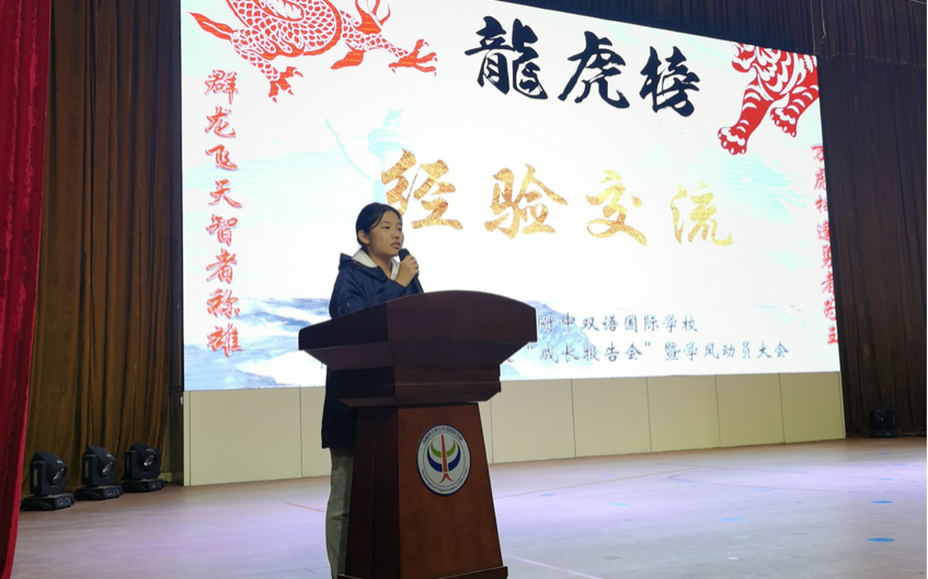 榜样在身边,鼓舞着我们,更为我们注入活力。颁奖结束,二班的吉静宜和七班的李昕彤同学上台演讲,进行学习经验的分享交流。他们总结了自己日常的学习心得,贯穿了课堂上学习和课下学习的诸多细节,从不同学科的特点出发进行经验分享,并从复习、预习、考试准备和卷面规范上给出了具体的做法建议,干货满满。两位同学表示今后会更加努力,和同学们互促互进,共同成长!